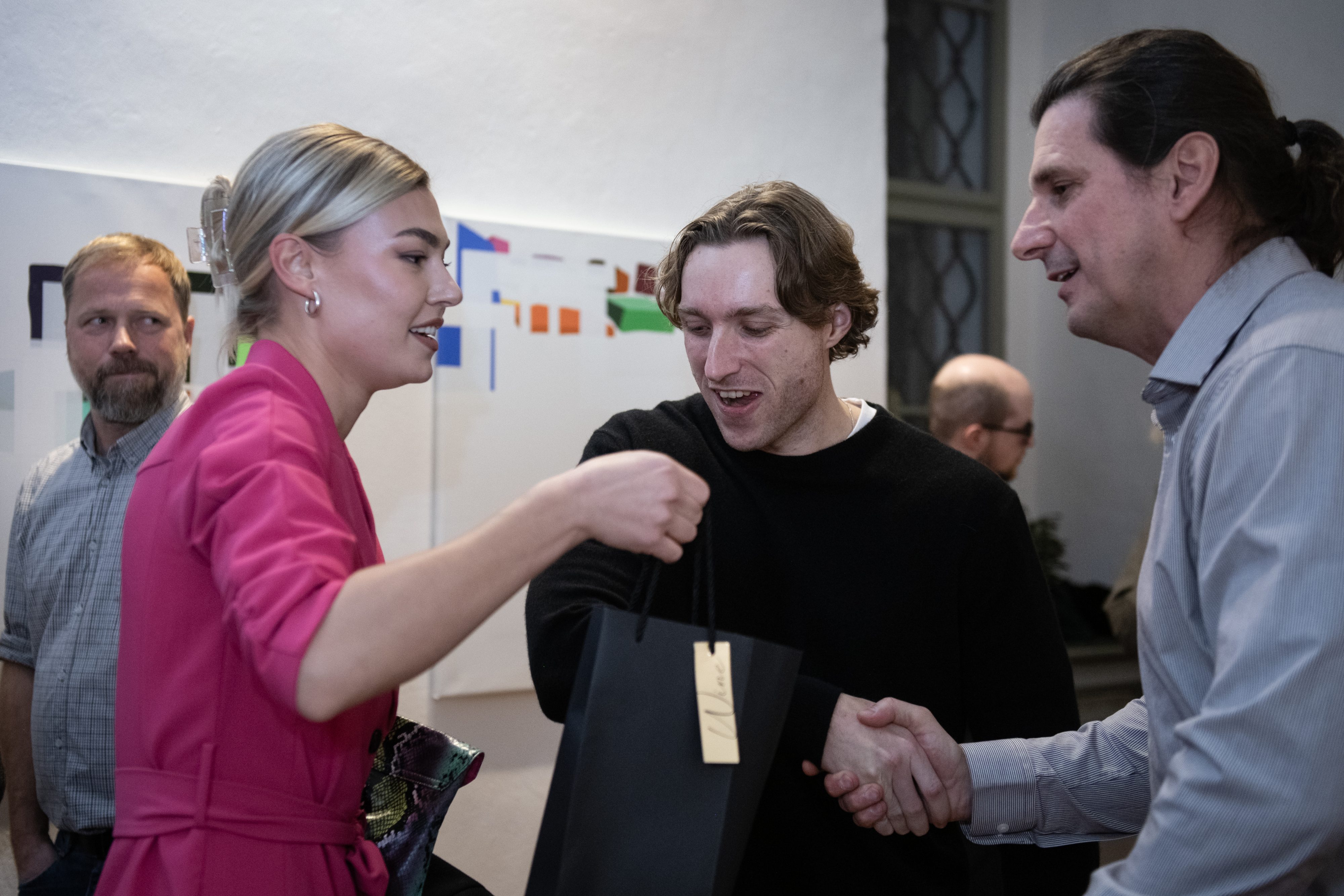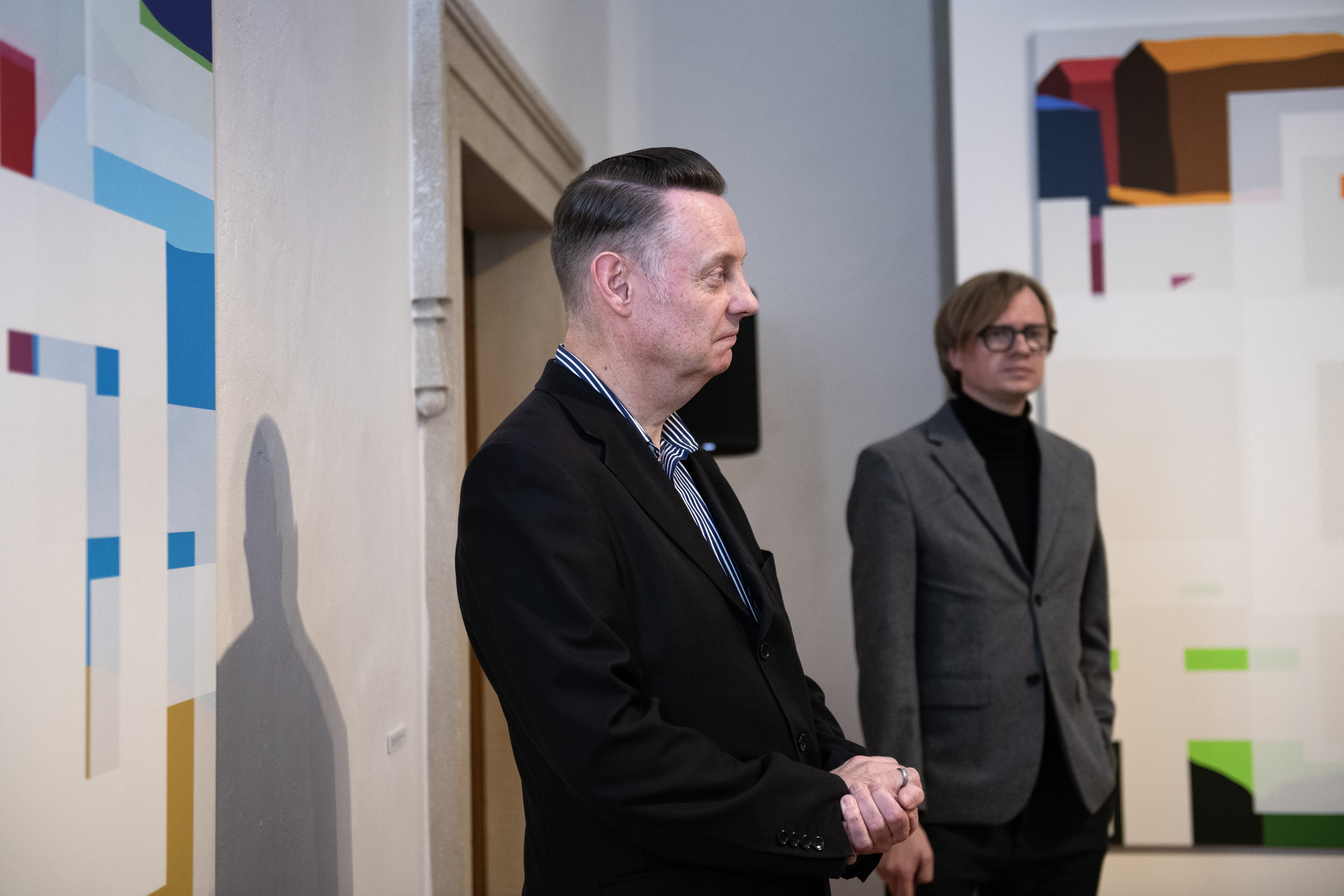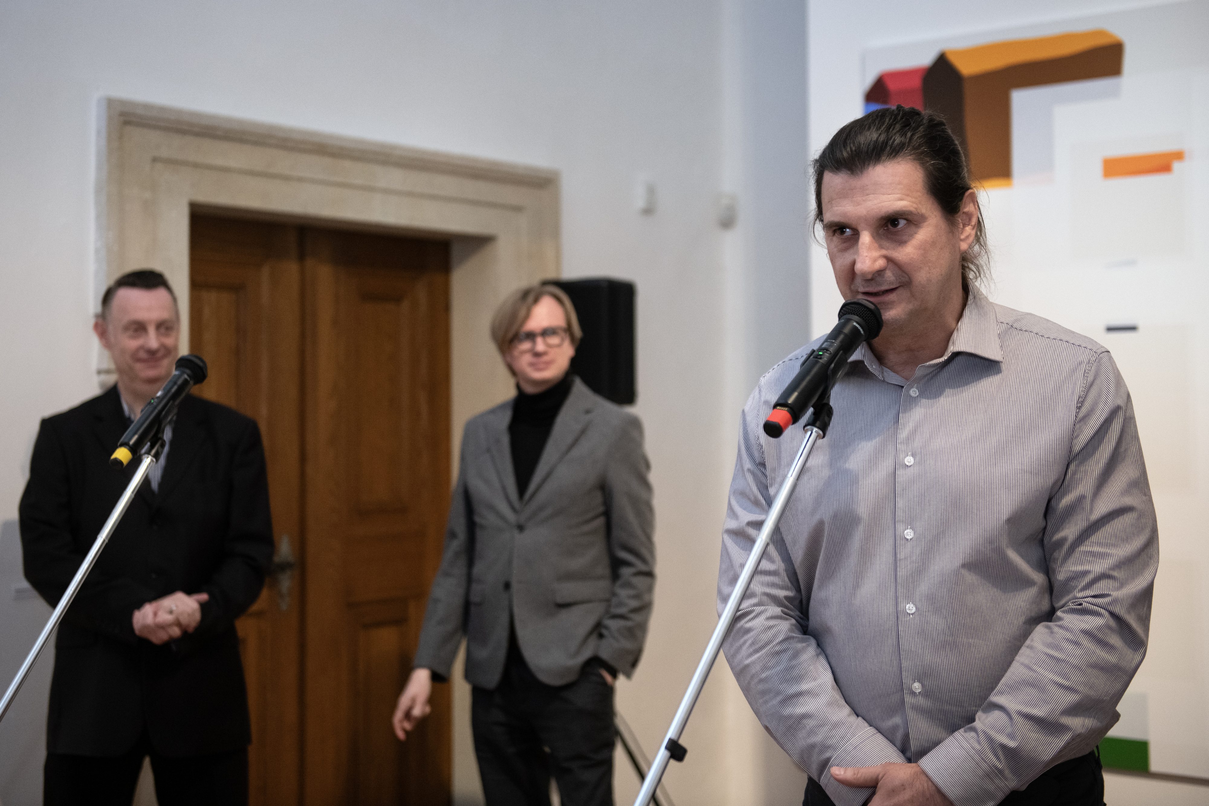 V GASK Aldin Popaja vystavuje obrazy ze dvou cyklů: Létající kameny (2023–24) a Kamenní spáči (2025). Oba tyto cykly se vztahují k fenoménu stećků čili náhrobních kamenů vzniklých mezi polovinou dvanáctého a začátkem šestnáctého století a nacházejících se převážně na území dnešní Bosny a Hercegoviny. Výjimečnost těchto středověkých vápencových svědků spočívá v tom, že vznikly jako společná tradice bosenské, katolické i pravoslavné církve. Interkonfesní charakter stećků se nejzřetelněji projevuje ve vizuální symbolice, přesahující rámec jednotlivých vyznání (i křesťanství samého), jako například srpek měsíce, šesticípá hvězda, spirála, rozeta, lilie, vinné listy a hrozny, pták, jelen, kůň, ale i výjevy z lidského života (lov, rytířské turnaje či známý motiv člověka se zvednutou pravicí). V této duchovní inkluzivitě nachází Aldin Popaja (a to zejména ve světle mnohdy násilné apropriace symboliky identity v moderní době) výmluvné svědectví o vzácné hodnotě sdílené kultury.