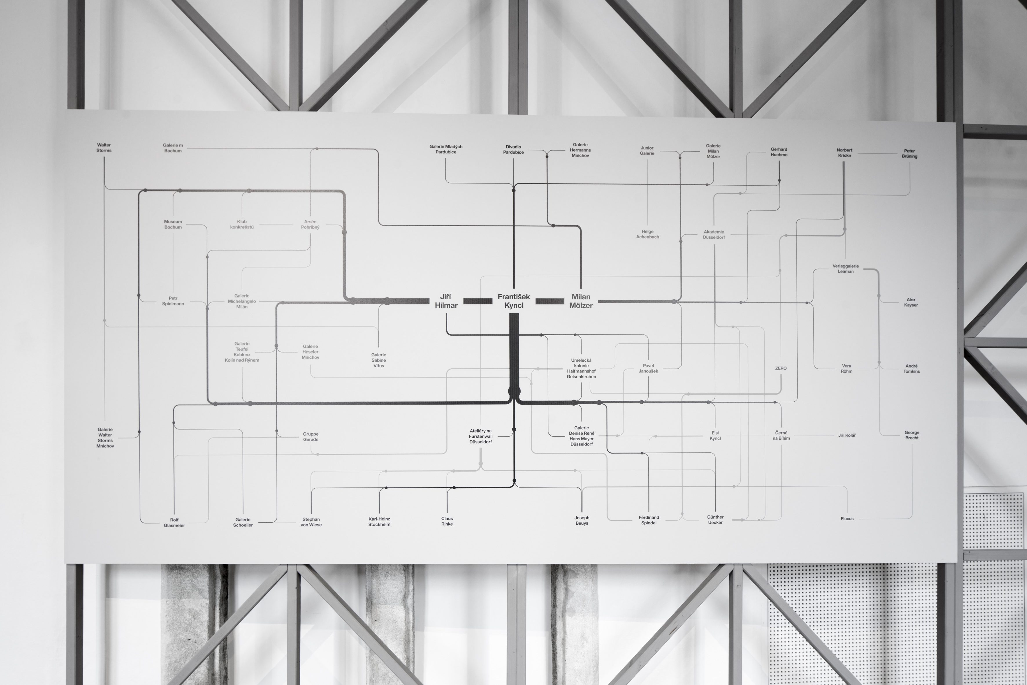 Výstava je koncipována jako mapa vztahů, míst a událostí, které formovaly jejich exilové působení. Kurátorský koncept vychází z principu „sítě“: sleduje uzlové body jejich aktivit v západním Německu, rekonstruuje společné výstavy, profesní i přátelské vazby, kontakty s galeristy, teoretiky a institucionálním prostředím a zasazuje jejich práci do širšího kulturně-historického rámce. V tomto smyslu uvádí tvorbu Mölzera, Kyncla a Hilmara do mezinárodního dialogu s progresivními proudy soustředěnými kolem Düsseldorfu, včetně okruhu skupiny ZERO. Připomíná také dobové souvislosti spjaté s osobnostmi typu Josepha Beuyse či s autory, pedagogy a sochaři působícími v tomto prostředí (např. Günter Uecker, Norbert Kricke, Klaus Rinke).