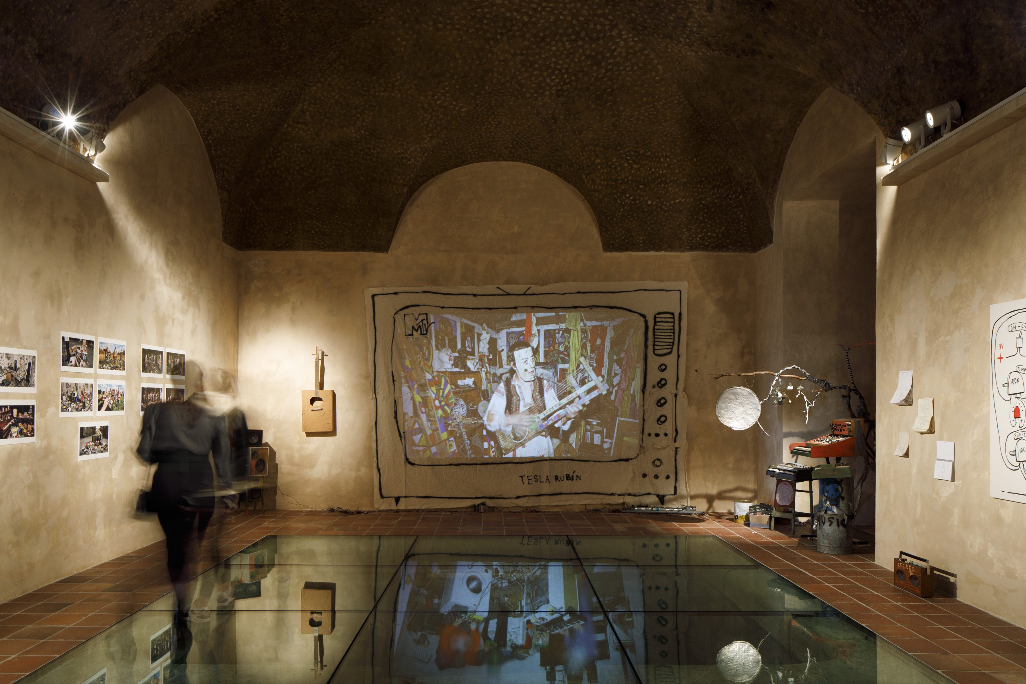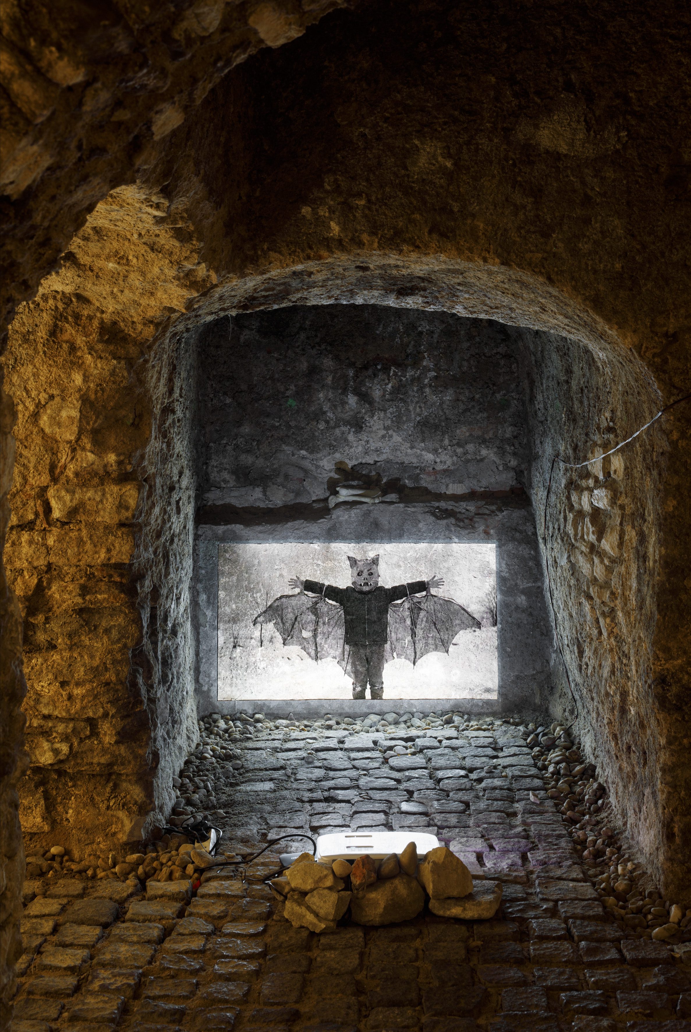 Samotný prostor sklepení se stává spoluautorem instalace. Kamenná struktura, chlad, ponurost a křížový půdorys vytvářejí téměř rituální prostředí, připomínající kryptu jakési reziduální minulosti. Proměnlivost instalace v průběhu výstavy (obměna proběhne v červnu po zvukovém festivalu A Day of Sound) dále zdůrazňuje nestálost obrazů i neustálé přepisování dějin.